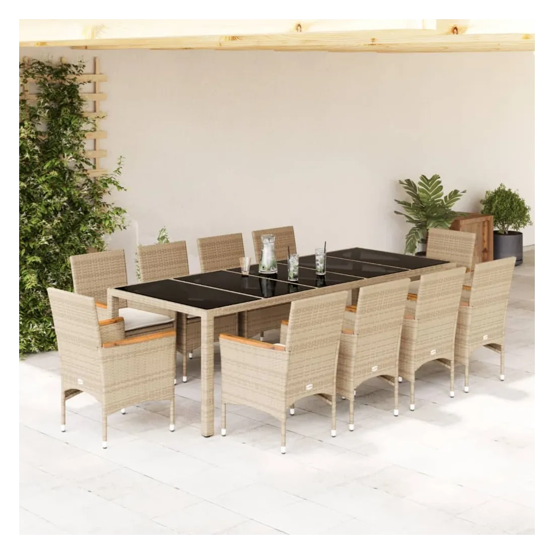 Ensemble à manger de jardin et coussins 11pcs beige rotin verre
