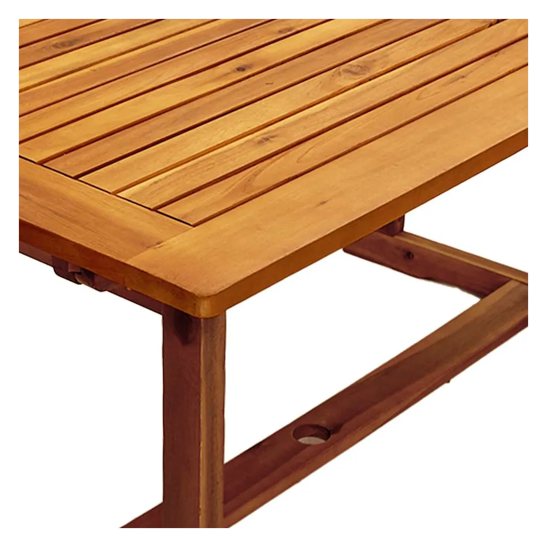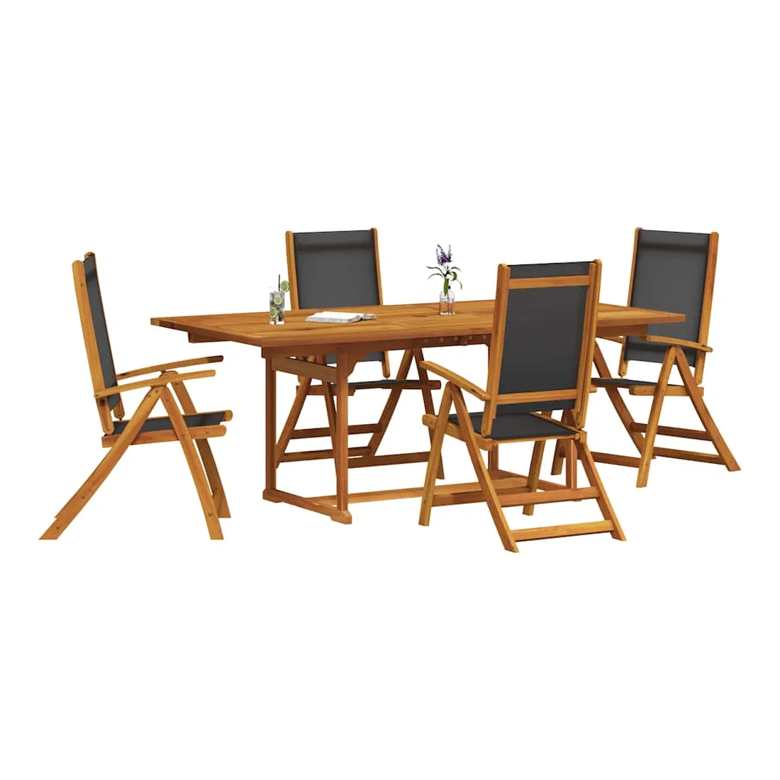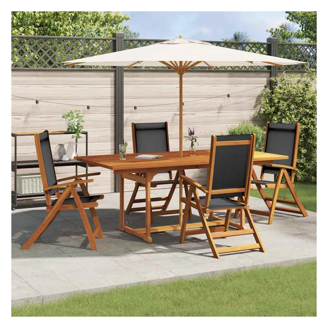 vidaXLProfitez d'un bon repas en plein air avec votre famille et vos amis avec cet ensemble de salle à manger de jardin en bois ! Bois d'acacia massif : l'ensemble à manger d’extérieur est fabriqué en bois d'acacia massif. Le bois d'acacia massif est un beau matériau naturel. Le bois d'acacia est un bois dur tropical, dense, robuste et durable.Fonction réglable et pliable : la chaise de jardin peut être réglée en 5 positions, afin que vous puissiez toujours trouver la position d'assise la plus confortable. Elle peut également être repliée pour économiser de l'espace lorsqu'elle n'est pas utilisée.Design pratique : le dessus de table est doté d'un trou pour parasol, ce qui vous permet de fixer facilement un parasol pour créer un coin ombragé.Dessus de table robuste : cette table à manger de jardin vous offre un dessus de table solide. Vous pouvez placer vos collations, boissons et n'importe laquelle de vos décorations préférées.Surface facile à nettoyer : la surface à finition à l'huile rend cette table et ces chaises de jardin faciles à nettoyer avec un chiffon humide. Bon à savoir :Pour que vos meubles d'extérieur restent beaux, nous vous recommandons de les protéger avec une housse imperméable.
