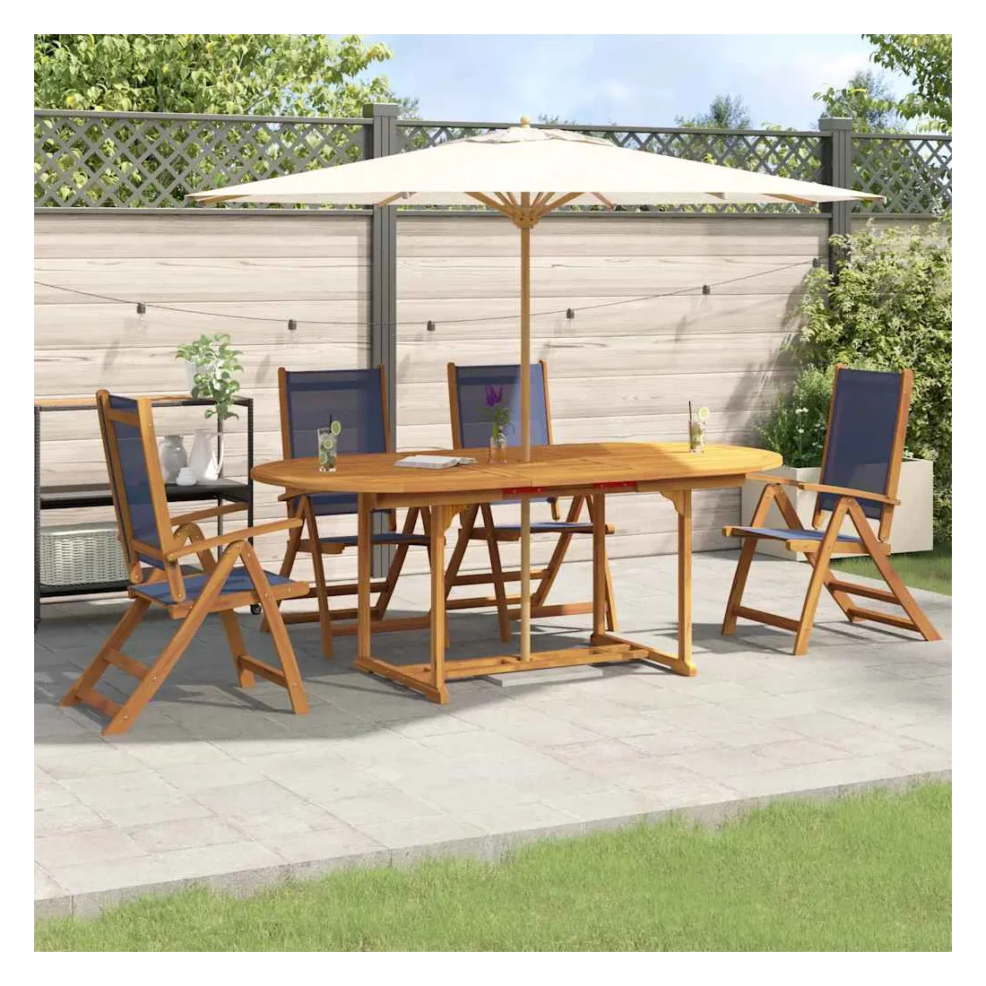 vidaXLProfitez d'un bon repas en plein air avec votre famille et vos amis avec cet ensemble de salle à manger de jardin en bois ! Bois d'acacia massif : l'ensemble à manger d’extérieur est fabriqué en bois d'acacia massif. Le bois d'acacia massif est un beau matériau naturel. Le bois d'acacia est un bois dur tropical, dense, robuste et durable. Fonction réglable et pliable : la chaise de jardin peut être réglée en 5 positions, afin que vous puissiez toujours trouver la position d'assise la plus confortable. Elle peut également être repliée pour économiser de l'espace lorsqu'elle n'est pas utilisée. Design pratique : grâce à son design spécial, cette table de jardin peut être rallongée lorsque de l'espace supplémentaire est nécessaire. De plus, il y a un trou pour parasol dans le dessus de la table, ce qui vous permet de fixer facilement un parasol pour créer un endroit ombragé. Dessus de table robuste : cette table à manger de jardin vous offre un dessus de table solide. Vous pouvez placer vos collations, boissons et n'importe laquelle de vos décorations préférées. Surface facile à nettoyer : la surface à finition à l'huile rend cette table et ces chaises de jardin faciles à nettoyer avec un chiffon humide. Bon à savoir :Pour que vos meubles d'extérieur restent beaux, nous vous recommandons de les protéger avec une housse imperméable.