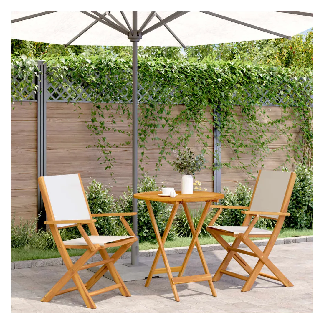 Savourez une tasse de café ou discutez avec votre famille et vos amis dans le jardin, l'arrière-cour ou sur le balcon avec cet ensemble de bistro ! Robuste et stable : le bois d'acacia massif est connu pour sa solidité et sa durabilité. Ses couleurs variées et ses grains uniques lui confèrent un aspect attrayant. Sa stabilité et sa résistance aux intempéries en font un matériau idéal pour la fabrication de meubles d'intérieur et d'extérieur.Conception pratique : la main courante en bois, pratique et plate, vous permet de poser vos mains dessus tout en profitant d'un moment en plein air.Dessus de table robuste : la table d'extérieur offre un excellent support pour accueillir vos boissons, collations, corbeilles de fruits et vos décorations préférées.Design pliable : la table et les chaises de salle à manger d'extérieur peuvent être facilement repliées lorsqu'elles ne sont pas utilisées pour faciliter le rangement et le transport. Bon à savoir :Pour que vos meubles d'extérieur restent beaux, nous vous recommandons de les protéger avec une housse imperméable.