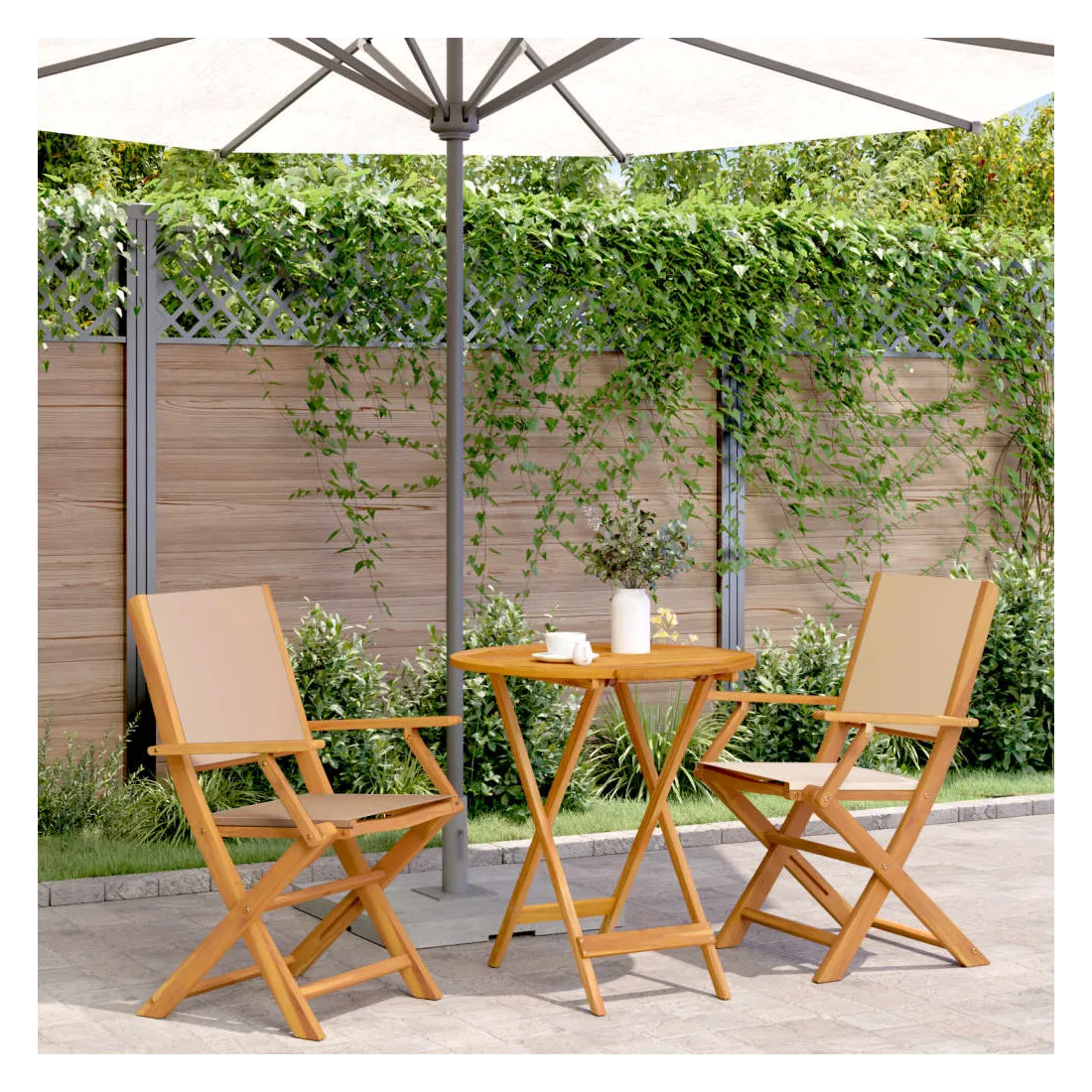 Savourez une tasse de café ou discutez avec votre famille et vos amis dans le jardin, l'arrière-cour ou sur le balcon avec cet ensemble de bistro ! Robuste et stable : le bois d'acacia massif est connu pour sa solidité et sa durabilité. Ses couleurs variées et ses grains uniques lui confèrent un aspect attrayant. Sa stabilité et sa résistance aux intempéries en font un matériau idéal pour la fabrication de meubles d'intérieur et d'extérieur.Conception pratique : la main courante en bois, pratique et plate, vous permet de poser vos mains dessus tout en profitant d'un moment en plein air.Dessus de table robuste : la table d'extérieur offre un excellent support pour accueillir vos boissons, collations, corbeilles de fruits et vos décorations préférées.Design pliable : la table et les chaises de salle à manger d'extérieur peuvent être facilement repliées lorsqu'elles ne sont pas utilisées pour faciliter le rangement et le transport. Bon à savoir :Pour que vos meubles d'extérieur restent beaux, nous vous recommandons de les protéger avec une housse imperméable.