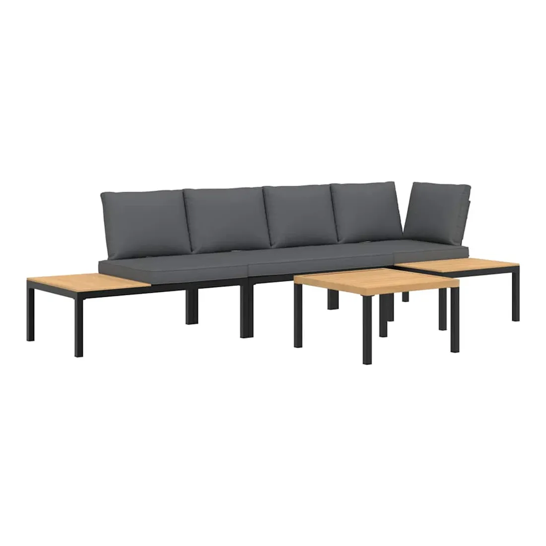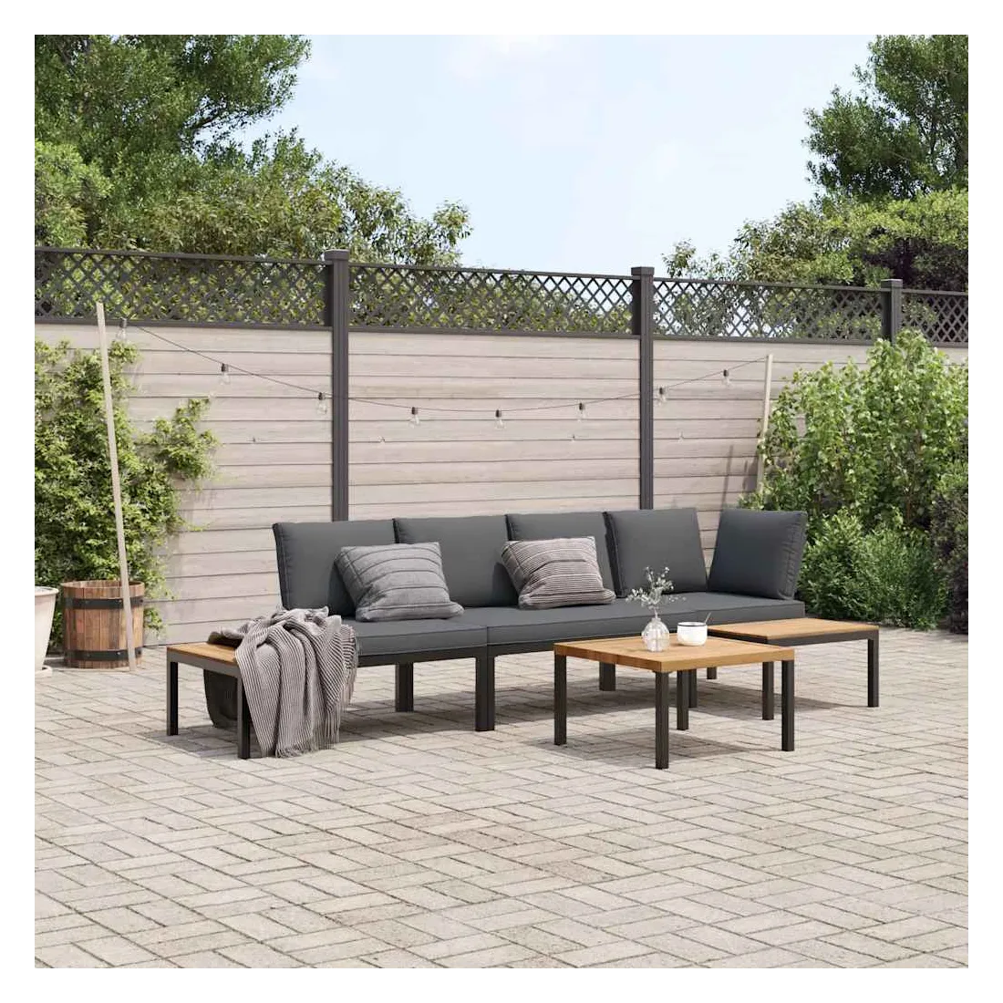 Cet ensemble de canapés de jardin est le complément parfait de votre arrière-cour, terrasse ou patio, offrant un espace confortable et accueillant pour discuter avec la famille et les amis ou simplement se détendre et profiter de l'extérieur. Durable et robuste : l'ensemble de canapés d'extérieur est fabriqué en aluminium, ce qui le rend résistant et durable.Dessus robuste : le dessus robuste de la table de patio est idéal pour placer vos boissons ou tout autre article dont vous avez besoin à portée de main.Expérience d'assise confortable : ce mobilier d'extérieur, doté de coussins épais, offre une expérience d'assise confortable. Housse amovible et lavable : ces coussins de siège sont dotés de housses amovibles pour un lavage et un entretien faciles.Conception modulaire : cet ensemble de meubles d'extérieur a une conception modulaire, ce qui le rend complètement flexible et facile à déplacer, afin que vous puissiez créer un agencement de meubles d'extérieur personnalisé. Bon à savoir :Pour que vos meubles d'extérieur restent beaux, nous vous recommandons de les protéger avec une housse imperméable.
