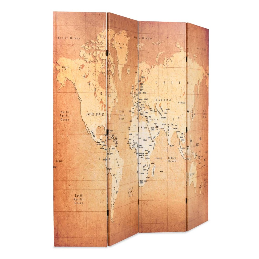 Cette cloison de séparation de 160 cm de largeur et de 170 cm de hauteur est idéale pour créer un espace intime ou séparer une partie de la chambre. Elle ajoutera une touche pratique et décorative à votre chambre à coucher, salon ou bureau. Le paravent a un cadre en bois solide et est recouvert de toile durable qui a une empreinte représentant une carte du monde dans les tons de terre et ajoutera une touche de charme moderne à votre intérieur. La cloison de séparation de pièce peut également être facilement repliée pour économiser de l'espace lorsqu'elle n'est pas utilisée.