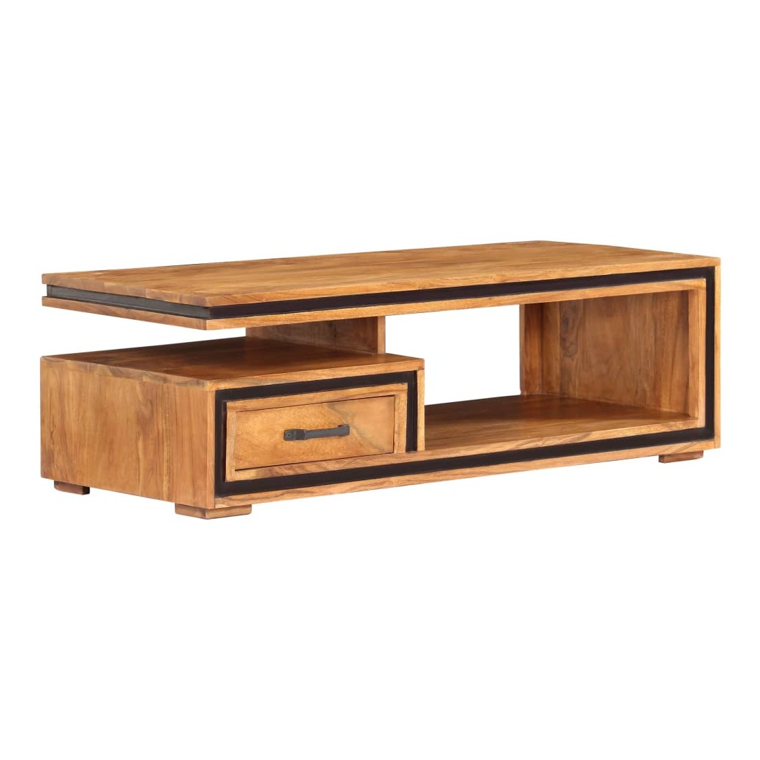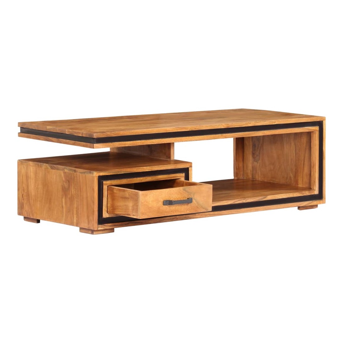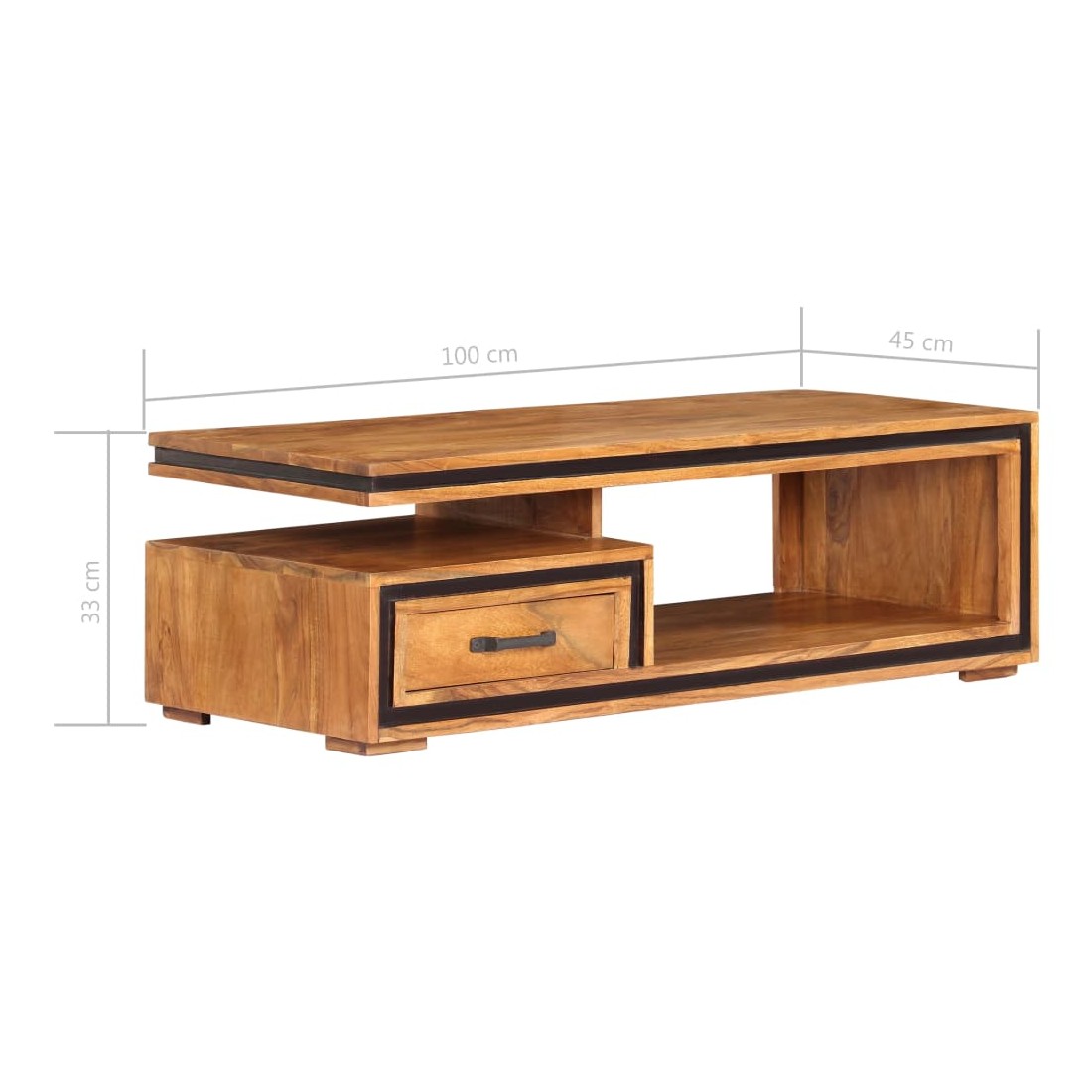 Cette table basse sera un supplément indémodable à votre décoration intérieure ! La table de canapé est faite de bois d'acacia solide avec une finition au toucher miel, ce qui la rend très durable et stable. Le bois d'acacia solide est un bois dur avec des beaux grains qui durera de nombreuses années. Semblable au bois d'acacia solide, connu sous le nom de bois de rose ou de palissandre, est également connu pour ses grains riches. Chaque étape du processus est réalisée avec le plus grand soin, que ce soit le polissage, la peinture ou le laquage. De plus, cette table de salon comprend 1 compartiment et 1 tiroir, offrant un espace commode pour ranger vos livres, vos tasses, ainsi que divers autres objets. Remarque importante : les couleurs et les grains de bois peuvent varier d'une pièce à l'autre, ce qui rend chaque pièce unique et légèrement différente l'une de l'autre. La livraison est aléatoire, ce qui garantit l'exclusivité et l'individualité de votre produit.