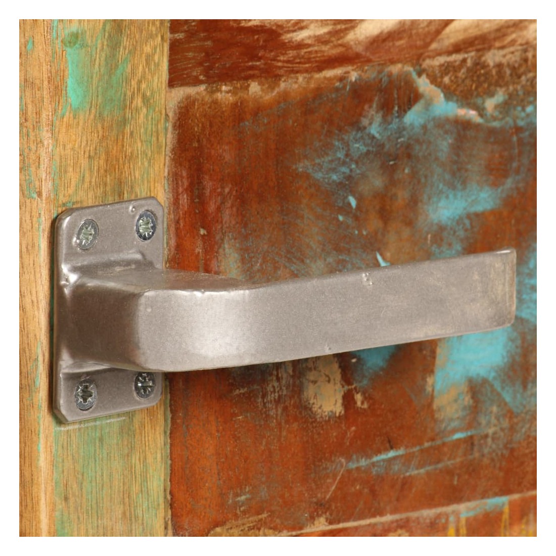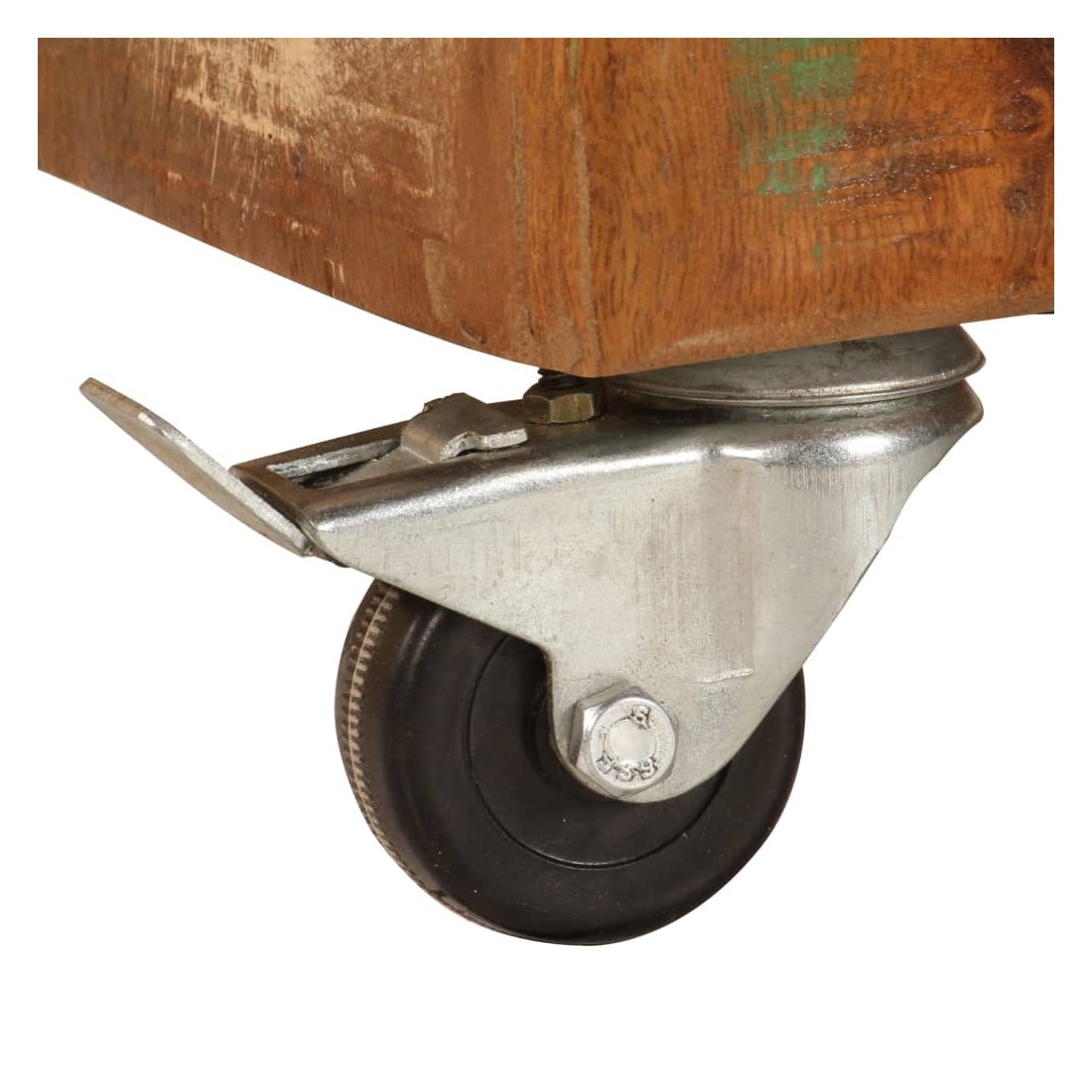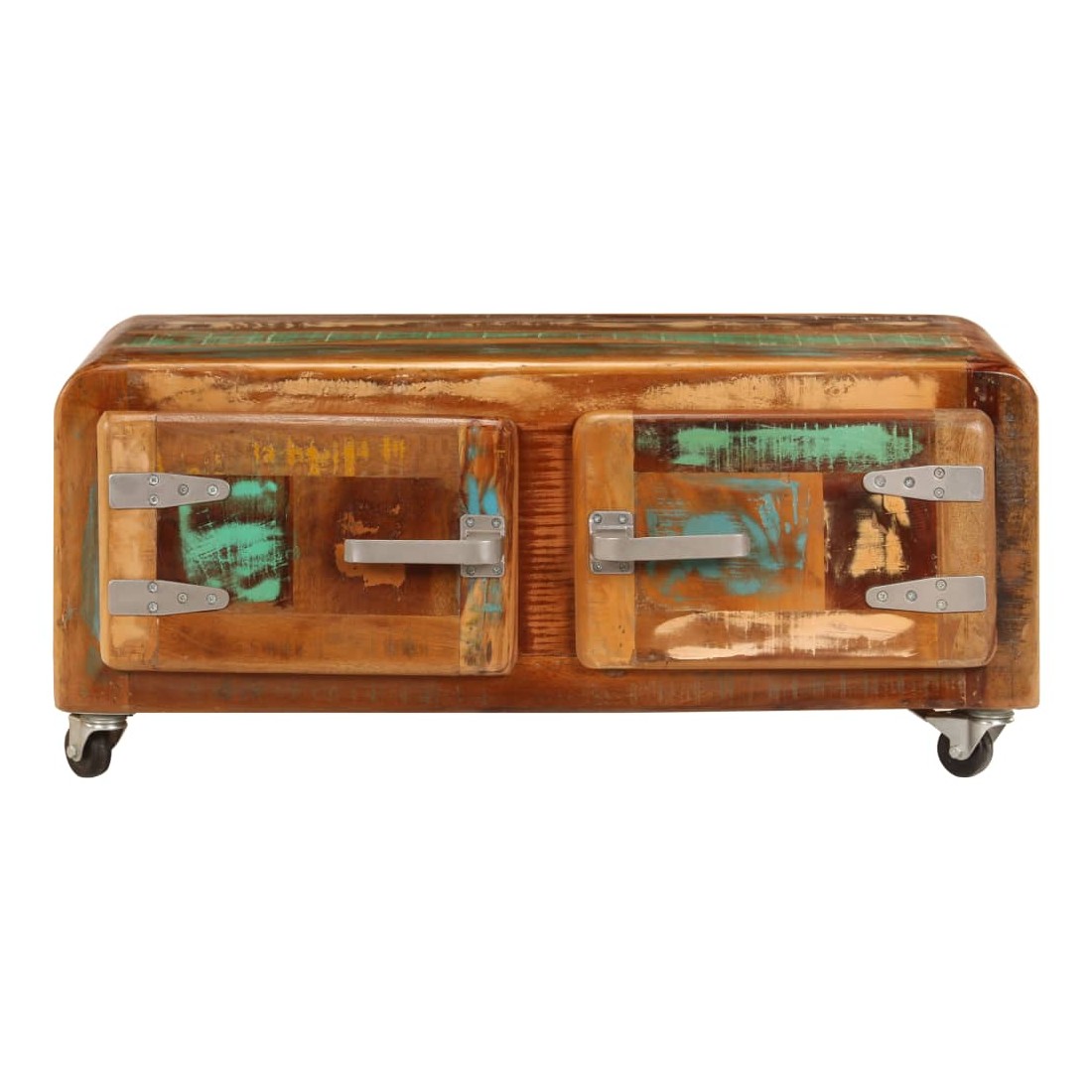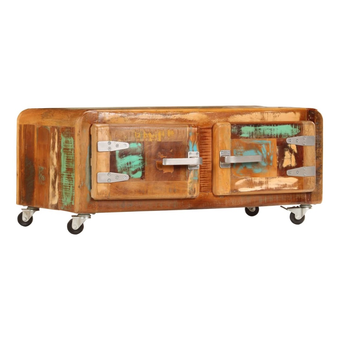 Cette table basse en bois de style classique dégage un charme pittoresque. Elle ajoutera à coup sûr une touche d'attention à votre intérieur. La table de canapé est faite de bois de récupération massif provenant des solives, des planchers et des poutres de soutien des vieux bâtiments démolis et elle peut être composée de différents types de bois comme le pin, le teck, le hêtre, le chêne, le cèdre, le manguier, le bois de l'acacia, etc. Cela signifie que le bois de récupération conserve les caractéristiques de ces différents types de bois. Le bois de récupération est déjà vieilli, patiné et séché, et par conséquent il ne rétrécit pas et ne se plie pas. Cette table d'appoint est entièrement faite à la main et les grains de bois raffinés rendent chaque meuble unique et légèrement différent l'un de l'autre. La quincaillerie métallique ajoute au style industriel de l'armoire. Cette table dispose de 2 armoires avec portes, offrant un espace ample pour ranger vos appareils multimédia, livres, ainsi que divers autres articles. Dotée de 4 roulettes, la table est facile à déplacer. Remarque importante : les couleurs varient d'une pièce à l'autre, rendant chaque pièce unique. La livraison est aléatoire, garantissant l'exclusivité et l'individualité de votre produit.