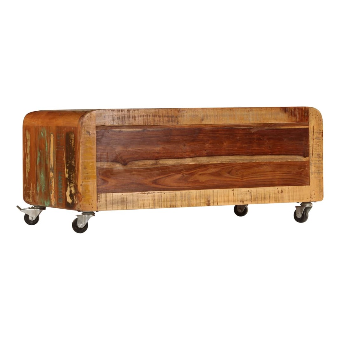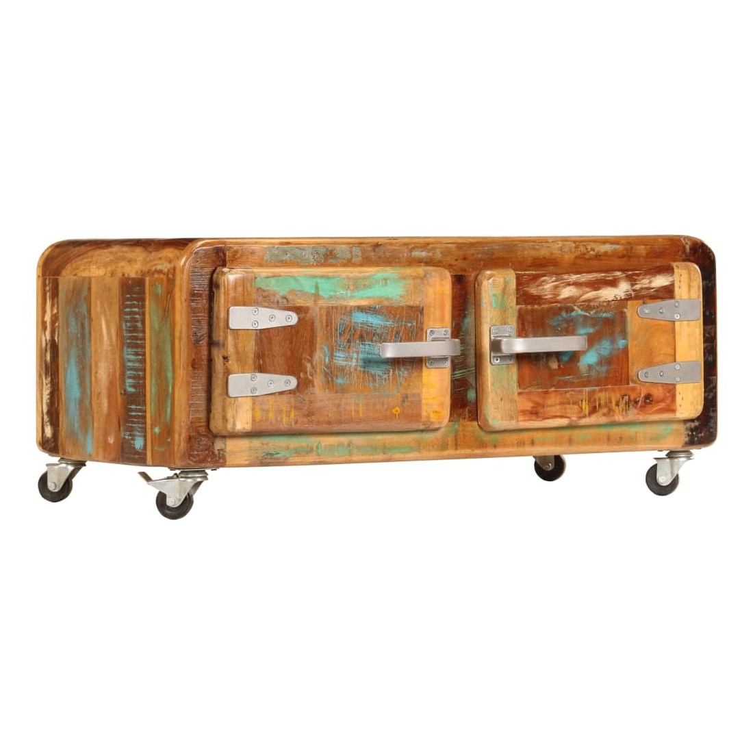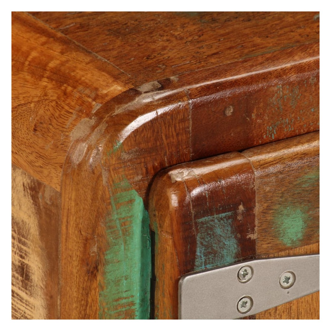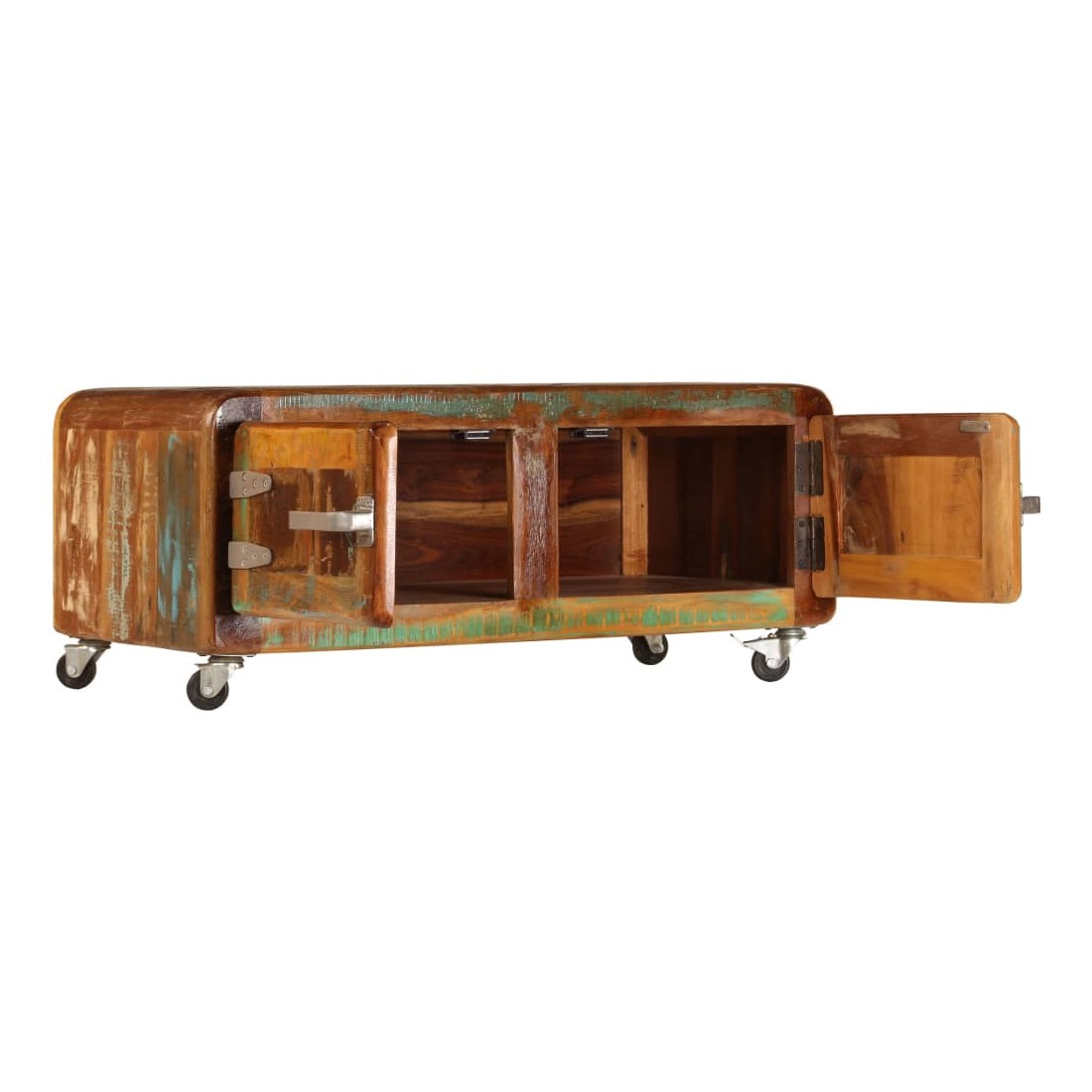 Cette table basse en bois de style classique dégage un charme pittoresque. Elle ajoutera à coup sûr une touche d'attention à votre intérieur. La table de canapé est faite de bois de récupération massif provenant des solives, des planchers et des poutres de soutien des vieux bâtiments démolis et elle peut être composée de différents types de bois comme le pin, le teck, le hêtre, le chêne, le cèdre, le manguier, le bois de l'acacia, etc. Cela signifie que le bois de récupération conserve les caractéristiques de ces différents types de bois. Le bois de récupération est déjà vieilli, patiné et séché, et par conséquent il ne rétrécit pas et ne se plie pas. Cette table d'appoint est entièrement faite à la main et les grains de bois raffinés rendent chaque meuble unique et légèrement différent l'un de l'autre. La quincaillerie métallique ajoute au style industriel de l'armoire. Cette table dispose de 2 armoires avec portes, offrant un espace ample pour ranger vos appareils multimédia, livres, ainsi que divers autres articles. Dotée de 4 roulettes, la table est facile à déplacer. Remarque importante : les couleurs varient d'une pièce à l'autre, rendant chaque pièce unique. La livraison est aléatoire, garantissant l'exclusivité et l'individualité de votre produit.