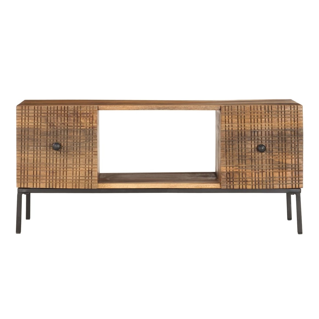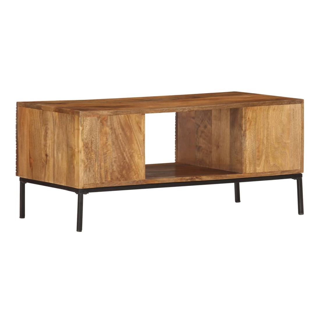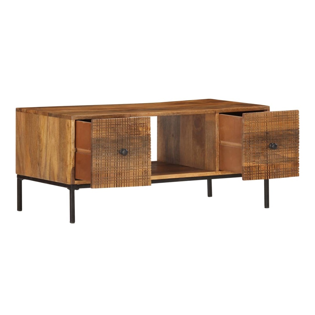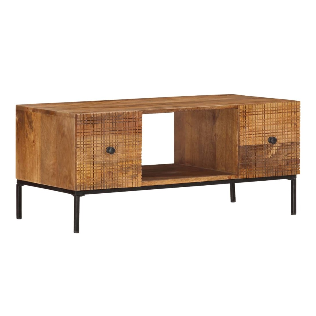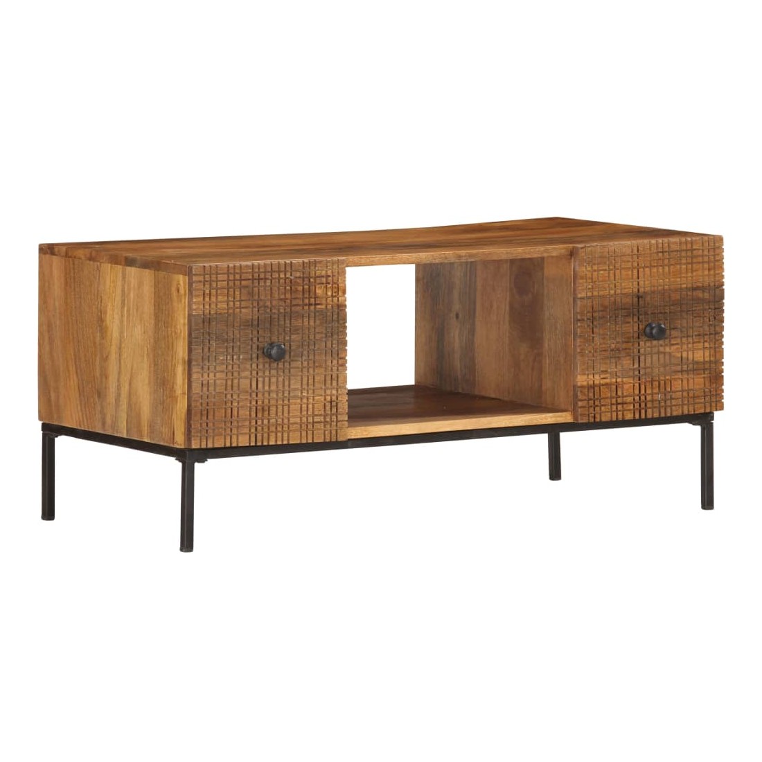 vidaXLCette table basse de style industriel en bois dégage un charme vintage et sera un supplément intemporel à votre intérieur. La table basse, avec des motifs sculptés à la main à l'avant, est faite à la main en bois de manguier massif qui est un bois dur dense et robuste avec des belles stries et des contours bruns ou dorés sur sa surface. Chaque étape du processus est réalisée avec le plus grand soin, qu'il s'agisse de polissage ou de laquage, et le savoir-faire ajoute au style rétro spectaculaire. Les beaux grains de bois rendent chaque meuble unique et légèrement différent l'un de l'autre. Le cadre en acier enduit de poudre ajoute au style industriel de la table d'appoint. En outre, cette table de canapé comprend 2 portes et 1 compartiment ouvert, offrant suffisamment d'espace pour garder toutes sortes de petits objets organisés et à portée de main. L'article est facile à assembler. Remarque importante : les couleurs varient d'une pièce à l'autre, rendant chaque pièce unique. La livraison est aléatoire, garantissant l'exclusivité et l'individualité de votre produit.