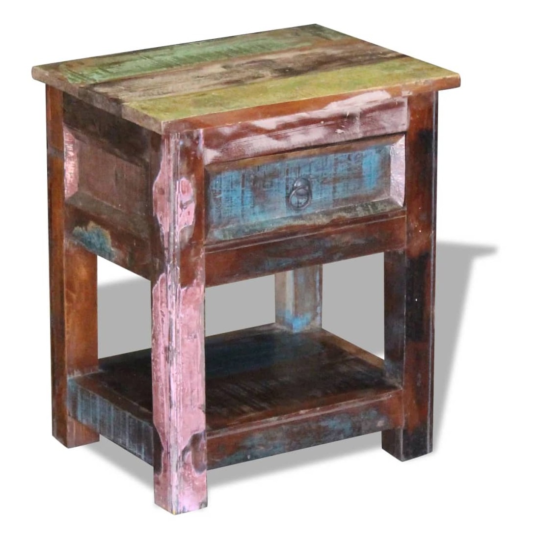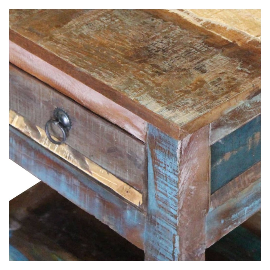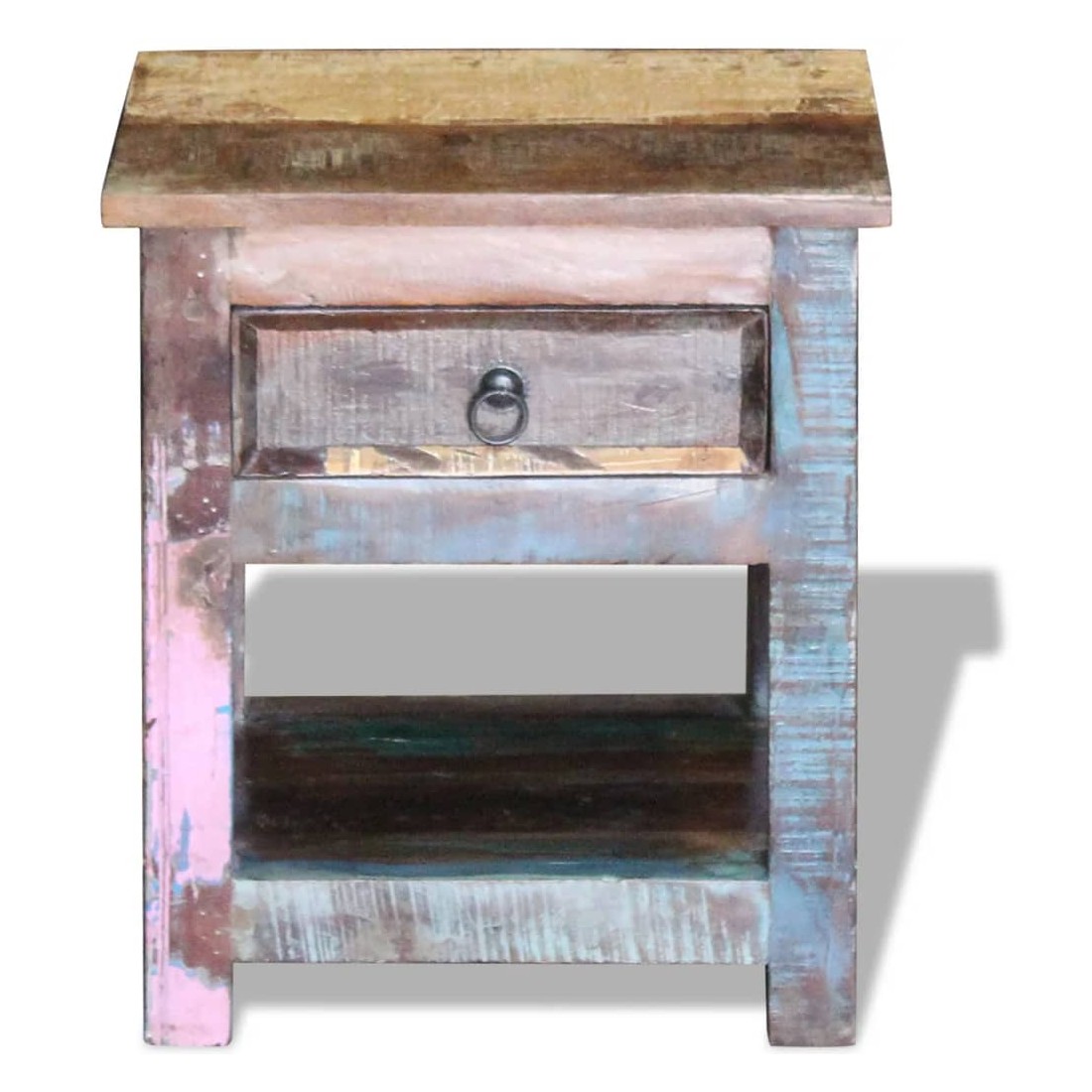Cette table d'appoint en bois rétro, avec un tiroir pour plus d'espace de rangement, sera un supplément élégant à votre maison. Elle peut également être utilisée comme table de chevet, armoire de chevet, armoire de chambre à coucher, table de salon, armoire à tiroirs, table de bout, support de téléphone, etc. Cette table est fabriquée en bois de récupération massif, ce qui signifie que chaque meuble est unique et légèrement différent l'un de l'autre. Les meubles en bois de récupération ont les caractéristiques de différents bois comme le teck, le bois de manguier et l'acacia. Le bois de récupération est solide, stable, durable et beau. Des signes d'usure et une structure de grains visible donnent à chaque pièce sa propre histoire et un look unique. Ce buffet est entièrement fait à la main et la qualité de l'artisanat contribue à son style rétro spectaculaire. Chaque étape du processus est effectuée avec le plus grand soin, qu'il s'agisse de la recombinaison, le polissage, la peinture ou le cirage. Remarque importante : les couleurs varient d'une pièce à l'autre, rendant chacune de nos tables auxiliaires unique. La livraison est aléatoire, ce qui garantit l'exclusivité et l'individualité de votre produit.