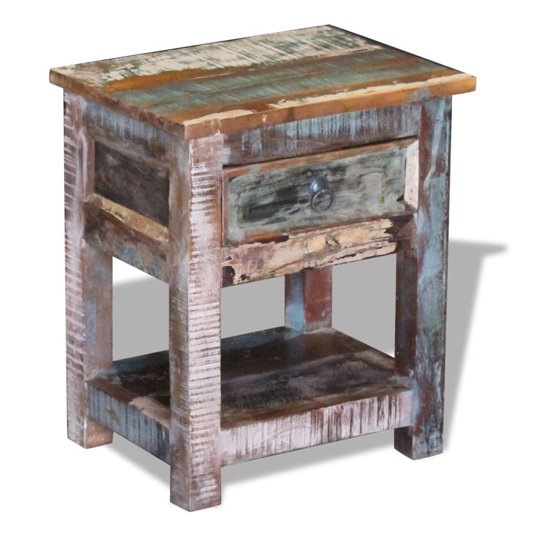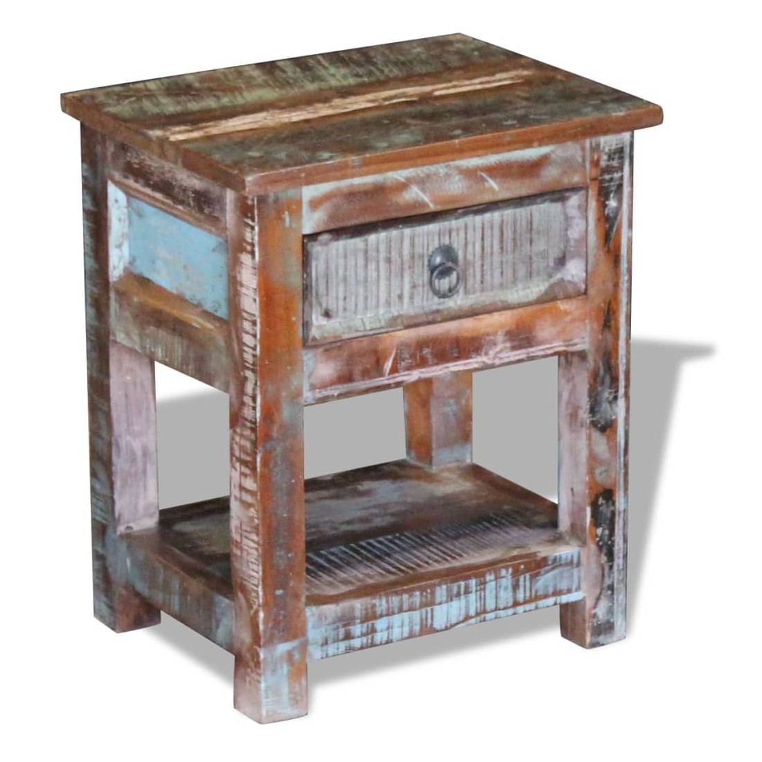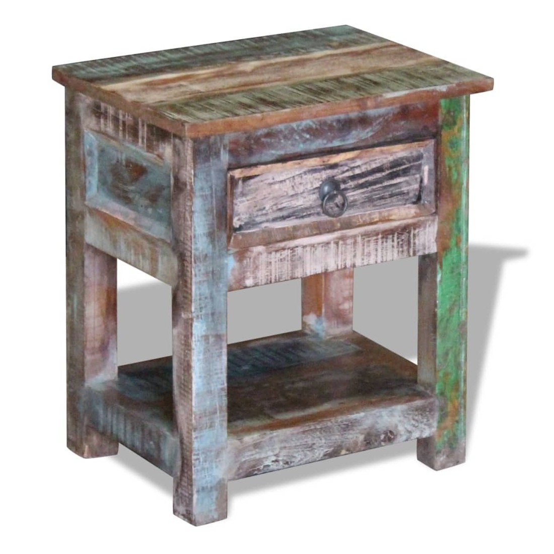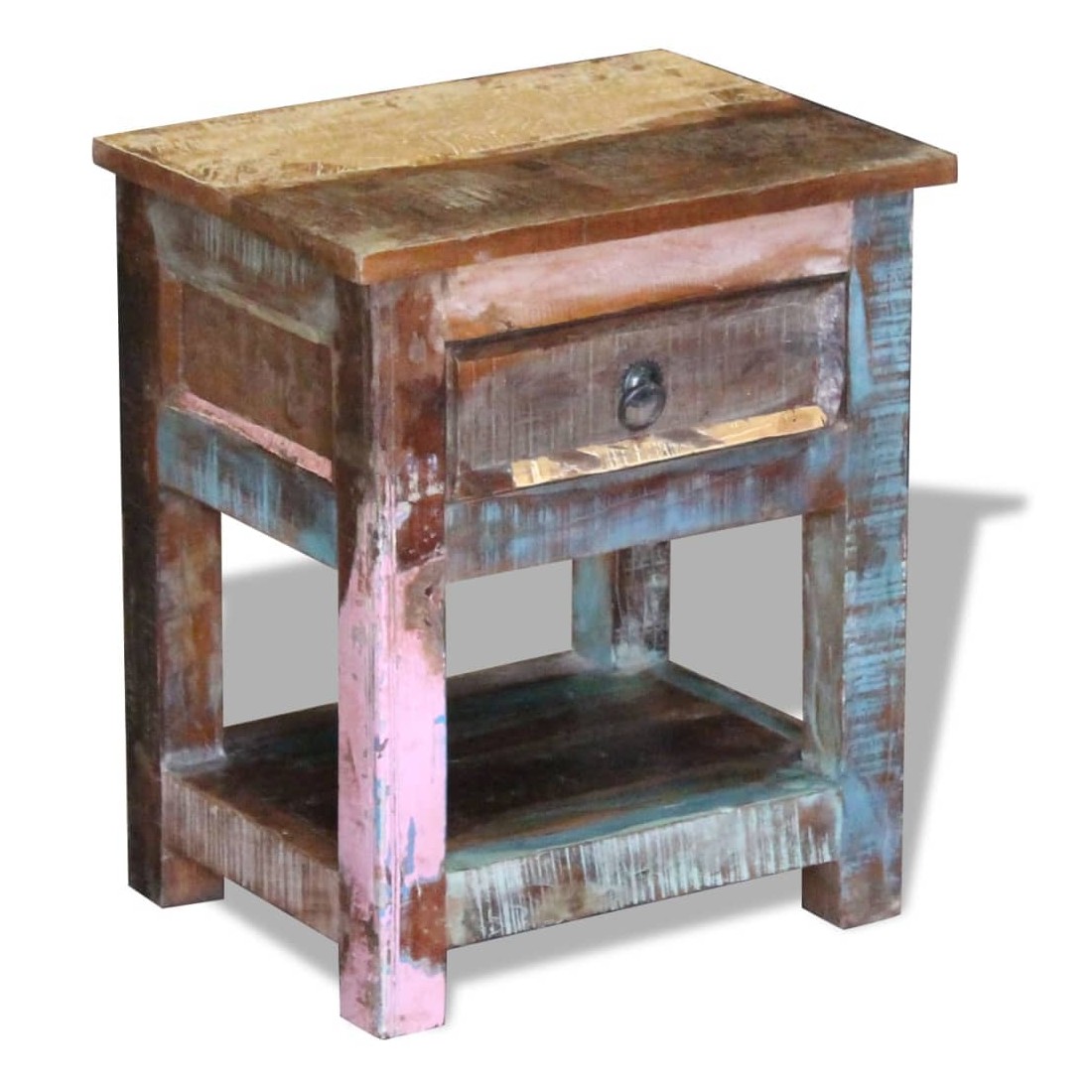 Cette table d'appoint en bois rétro, avec un tiroir pour plus d'espace de rangement, sera un supplément élégant à votre maison. Elle peut également être utilisée comme table de chevet, armoire de chevet, armoire de chambre à coucher, table de salon, armoire à tiroirs, table de bout, support de téléphone, etc. Cette table est fabriquée en bois de récupération massif, ce qui signifie que chaque meuble est unique et légèrement différent l'un de l'autre. Les meubles en bois de récupération ont les caractéristiques de différents bois comme le teck, le bois de manguier et l'acacia. Le bois de récupération est solide, stable, durable et beau. Des signes d'usure et une structure de grains visible donnent à chaque pièce sa propre histoire et un look unique. Ce buffet est entièrement fait à la main et la qualité de l'artisanat contribue à son style rétro spectaculaire. Chaque étape du processus est effectuée avec le plus grand soin, qu'il s'agisse de la recombinaison, le polissage, la peinture ou le cirage. Remarque importante : les couleurs varient d'une pièce à l'autre, rendant chacune de nos tables auxiliaires unique. La livraison est aléatoire, ce qui garantit l'exclusivité et l'individualité de votre produit.