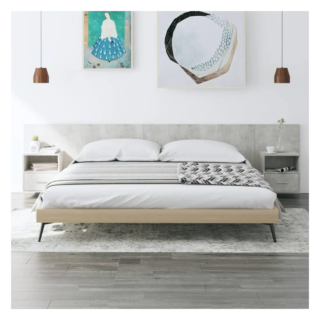 La tête de lit robuste avec armoires, au design classique, donne à votre cadre de lit un aspect complet et convient à toute chambre à coucher. Matériau robuste : le bois d'ingénierie est d'une qualité exceptionnelle avec une surface lisse et présente également résistance, stabilité et résistance à l'humidité.Design mural : les tables de chevet flottantes et la tête de lit peuvent être fixées au mur. De cette façon, vous pouvez maximiser votre espace au sol et garder la zone propre.Espace de rangement : l'unité de chevet dispose d'un espace de rangement spacieux qui vous permet de garder vos affaires organisées. ATTENTION :Les vis et les chevilles pour l'intérieur du mur ne sont pas incluses. Recherchez et utilisez des vis et des chevilles adaptées à vos murs. Si vous n'êtes pas sûr, demandez conseil à un professionnel. Lisez et suivez attentivement chaque étape des instructions.
