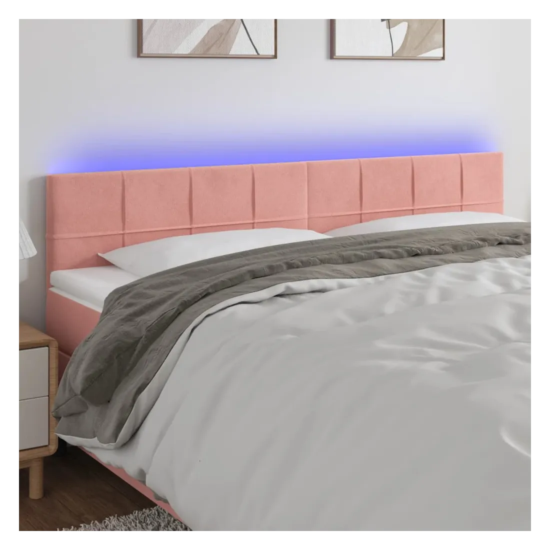 Cette tête de lit à LED classique, au design élégant, donne à votre cadre de lit une touche de modernité étonnante et convient parfaitement à toute chambre à coucher. Velours doux : le velours est un tissu doux et luxueux qui se reconnaît à son tas dense de fibres uniformément coupées qui ont une touche lisse. Le tissu en velours présente un toucher doux distinctif, ce qui le rend confortable au toucher.LED colorée : apportez de l'éclairage dans l'obscurité avec des lumières LED colorées !Hauteur réglable : la tête de lit est réglable en hauteur selon vos préférences.Excellent soutien : la tête de lit vous offre un excellent soutien du dos lorsque vous êtes assis dans votre lit pour lire ou regarder la télévision.Bande à LED découpable : cette bande à LED flexible peut être ajustée en longueur. Le symbole des ciseaux indique où la bande peut être coupée en toute sécurité sans l'endommager. Remarque :Seule la partie avec un symbole de ciseaux peut être coupée et seule la partie avec l'USB continuera à fonctionner comme avant.Chaque produit est livré avec un manuel de montage dans la boîte pour un montage facile.Ce produit est doté d'un connecteur USB, mais la source d'alimentation certifiée de USB 5V n'est pas incluse.