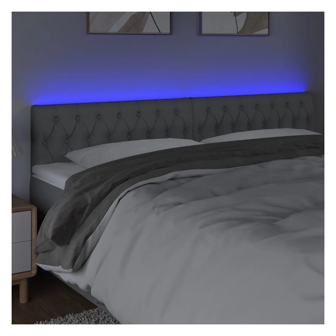 Cette tête de lit à LED classique, au design élégant, donne à votre cadre de lit une touche de modernité étonnante et convient parfaitement à toute chambre à coucher. Tissu durable : le tissu présente un aspect simple et épuré, et il est respirant et durable. LED colorée : apportez de l'éclairage dans l'obscurité avec des lumières LED colorées ! Hauteur réglable : la tête de lit est réglable en hauteur selon vos préférences. Excellent soutien : la tête de lit vous offre un excellent soutien du dos lorsque vous êtes assis dans votre lit pour lire ou regarder la télévision. Bande à LED découpable : cette bande à LED flexible peut être ajustée en longueur. Le symbole des ciseaux indique où la bande peut être coupée en toute sécurité sans l'endommager. Remarque : Seule la partie avec un sy