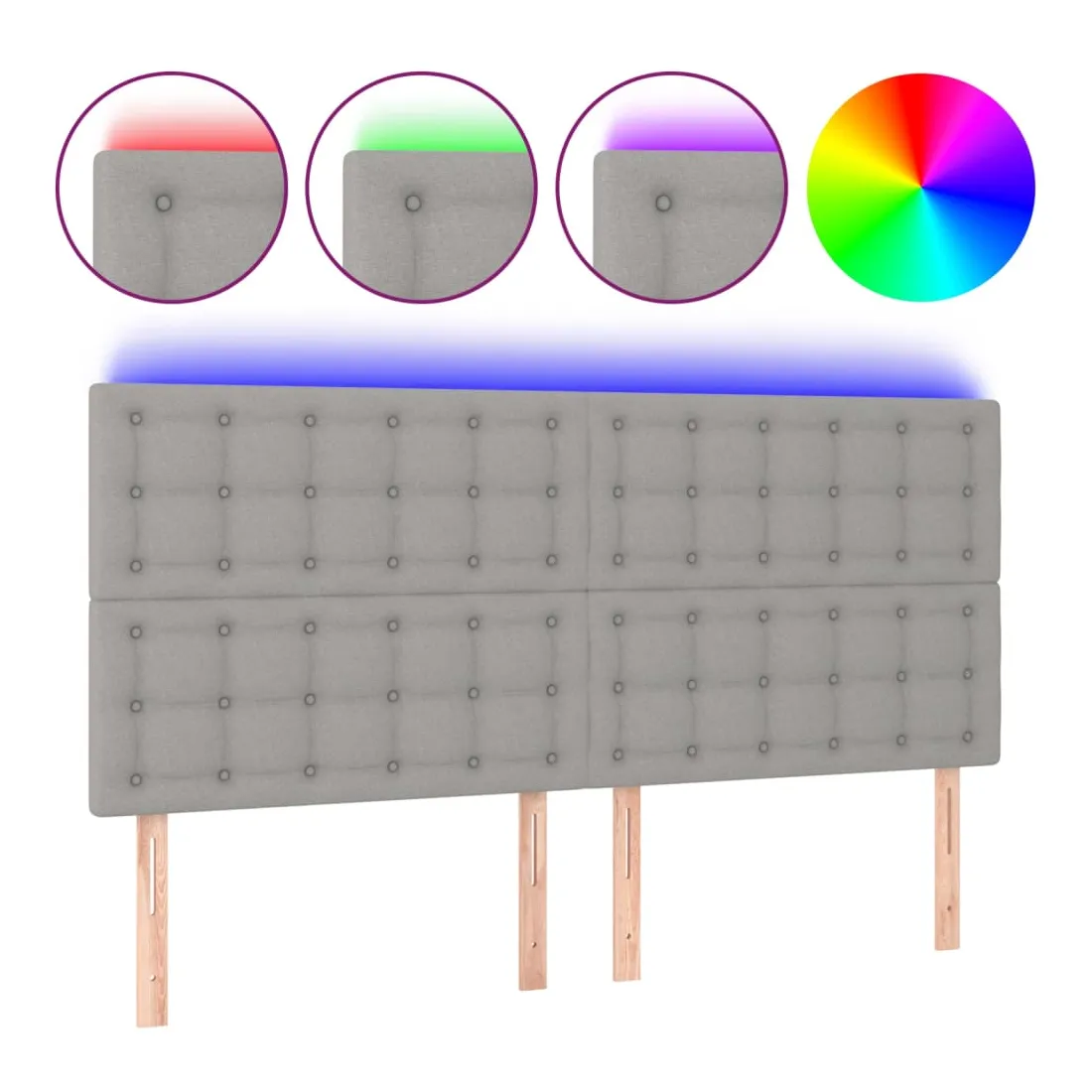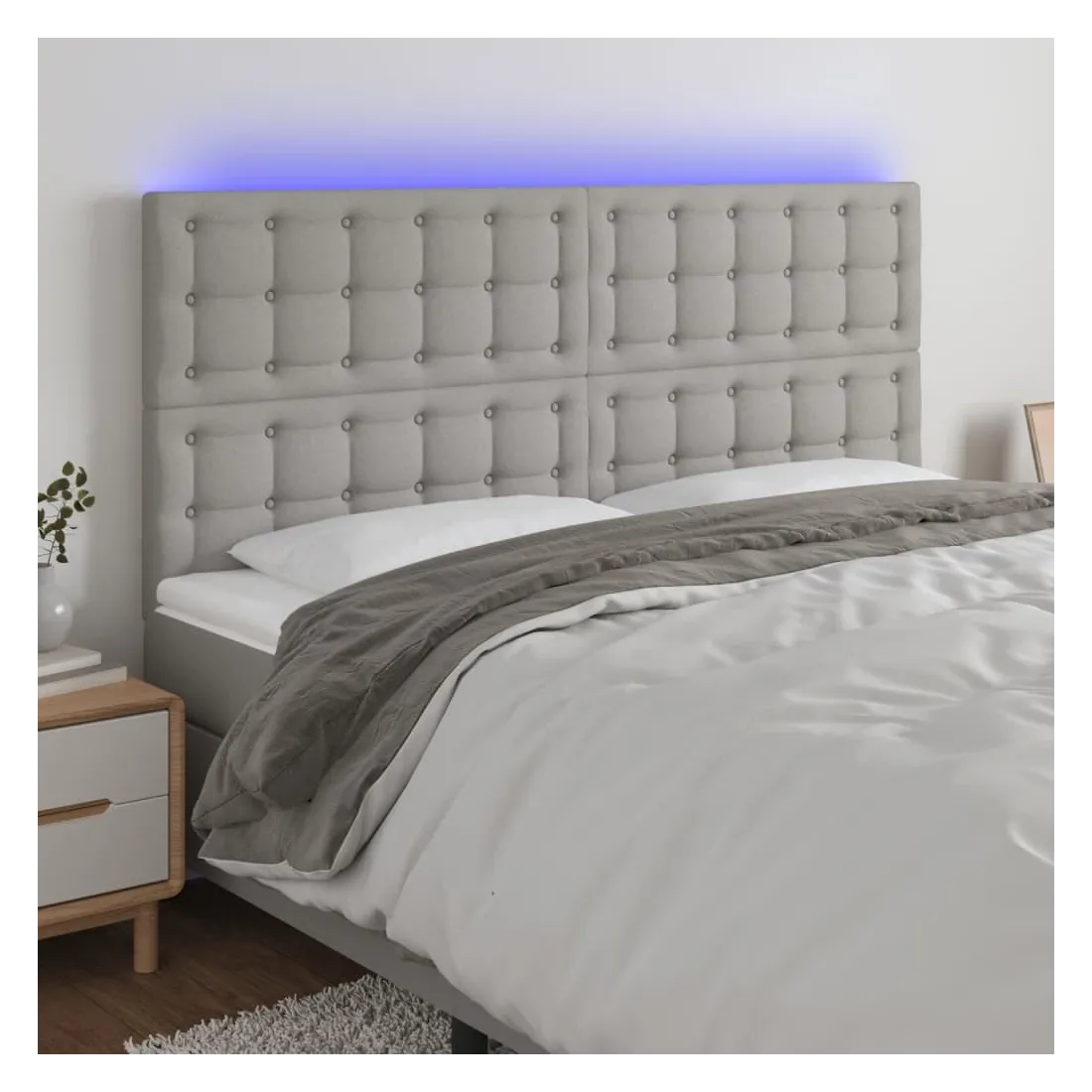 Cette tête de lit à LED classique, au design élégant, donne à votre cadre de lit une touche de modernité étonnante et convient parfaitement à toute chambre à coucher. Tissu durable : le tissu présente un aspect simple et épuré, et il est respirant et durable. LED colorée : apportez de l'éclairage dans l'obscurité avec des lumières LED colorées ! Hauteur réglable : la tête de lit est réglable en hauteur selon vos préférences. Excellent soutien : la tête de lit vous offre un excellent soutien du dos lorsque vous êtes assis dans votre lit pour lire ou regarder la télévision. Bande à LED découpable : cette bande à LED flexible peut être ajustée en longueur. Le symbole des ciseaux indique où la bande peut être coupée en toute sécurité sans l'endommager. Remarque : Seule la partie avec un sy