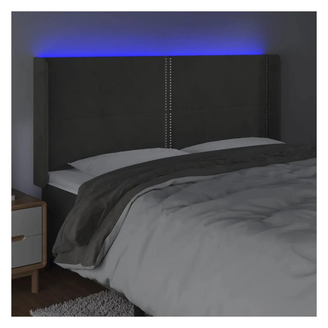 Cette tête de lit à LED classique, au design élégant, donne à votre cadre de lit une touche de modernité étonnante et convient parfaitement à toute chambre à coucher. Velours doux : le velours est un tissu doux et luxueux qui se reconnaît à son tas dense de fibres uniformément coupées qui ont une touche lisse. Le tissu en velours présente un toucher doux distinctif, ce qui le rend confortable au toucher.LED colorée : apportez de l'éclairage dans l'obscurité avec des lumières LED colorées !Hauteur réglable : la tête de lit est réglable en hauteur selon vos préférences.Excellent soutien : la tête de lit vous offre un excellent soutien du dos lorsque vous êtes assis dans votre lit pour lire ou regarder la télévision.Bande à LED découpable : cette bande à LED flexible peut être ajustée en longueur. Le symbole des ciseaux indique où la bande peut être coupée en toute sécurité sans l'endommager. Remarque :Seule la partie avec un symbole de ciseaux peut être coupée et seule la partie avec l'USB continuera à fonctionner comme avant.Chaque produit est livré avec un manuel de montage dans la boîte pour un montage facile.Ce produit est doté d'un connecteur USB, mais la source d'alimentation certifiée de USB 5V n'est pas incluse.